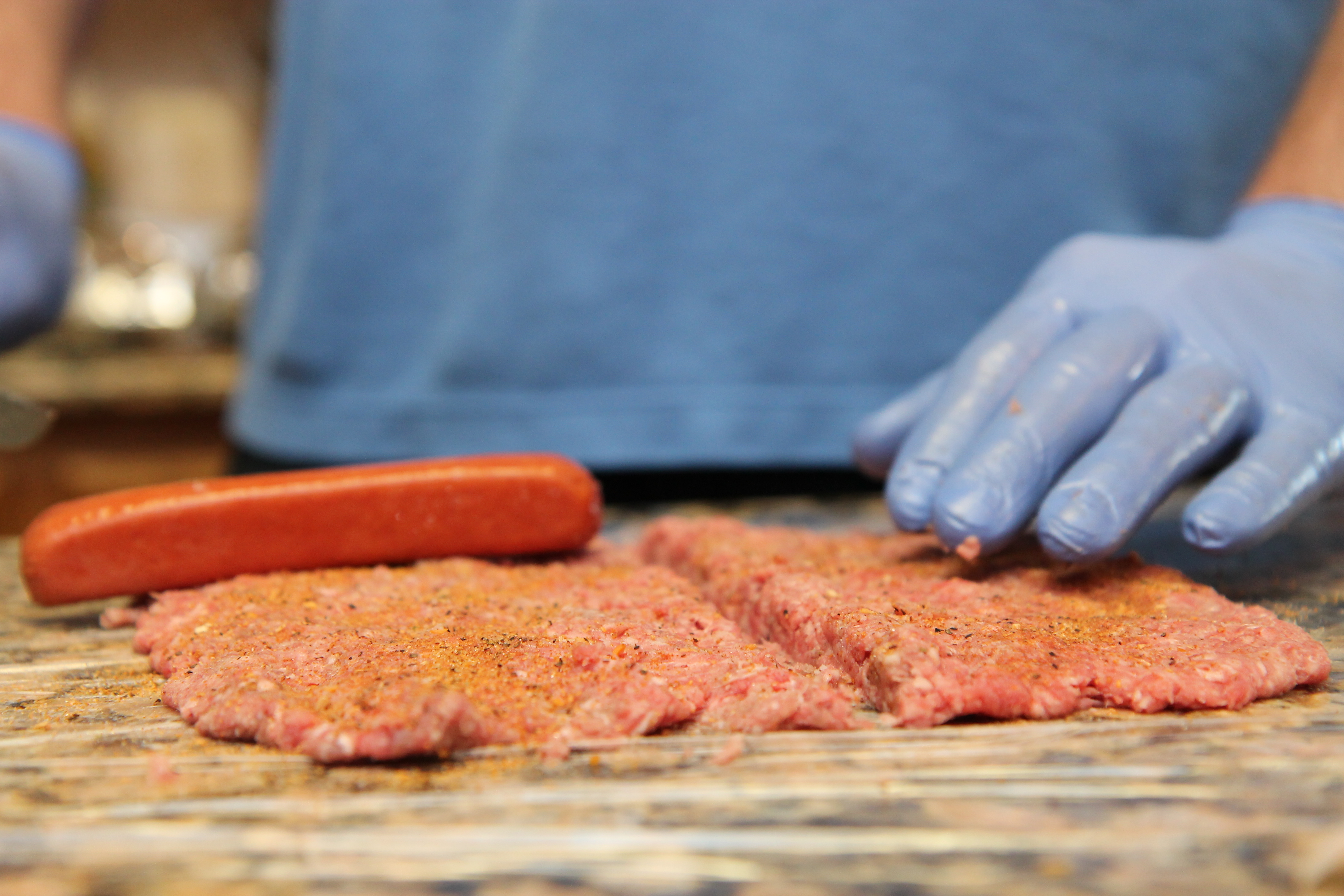 Take a Large Handful of Hamburger and knead it in your hands compressing the ground beef fibers together and then flatten out the ball onto the cutting board making a sheet of hamburger approx. 1/4″ thick. I ended up with a square around 10″ x 10″ and this is enough to roll 4 dogs with. After you flatten out your ground beef, season it with your preferred Gourmet Burger seasoning.