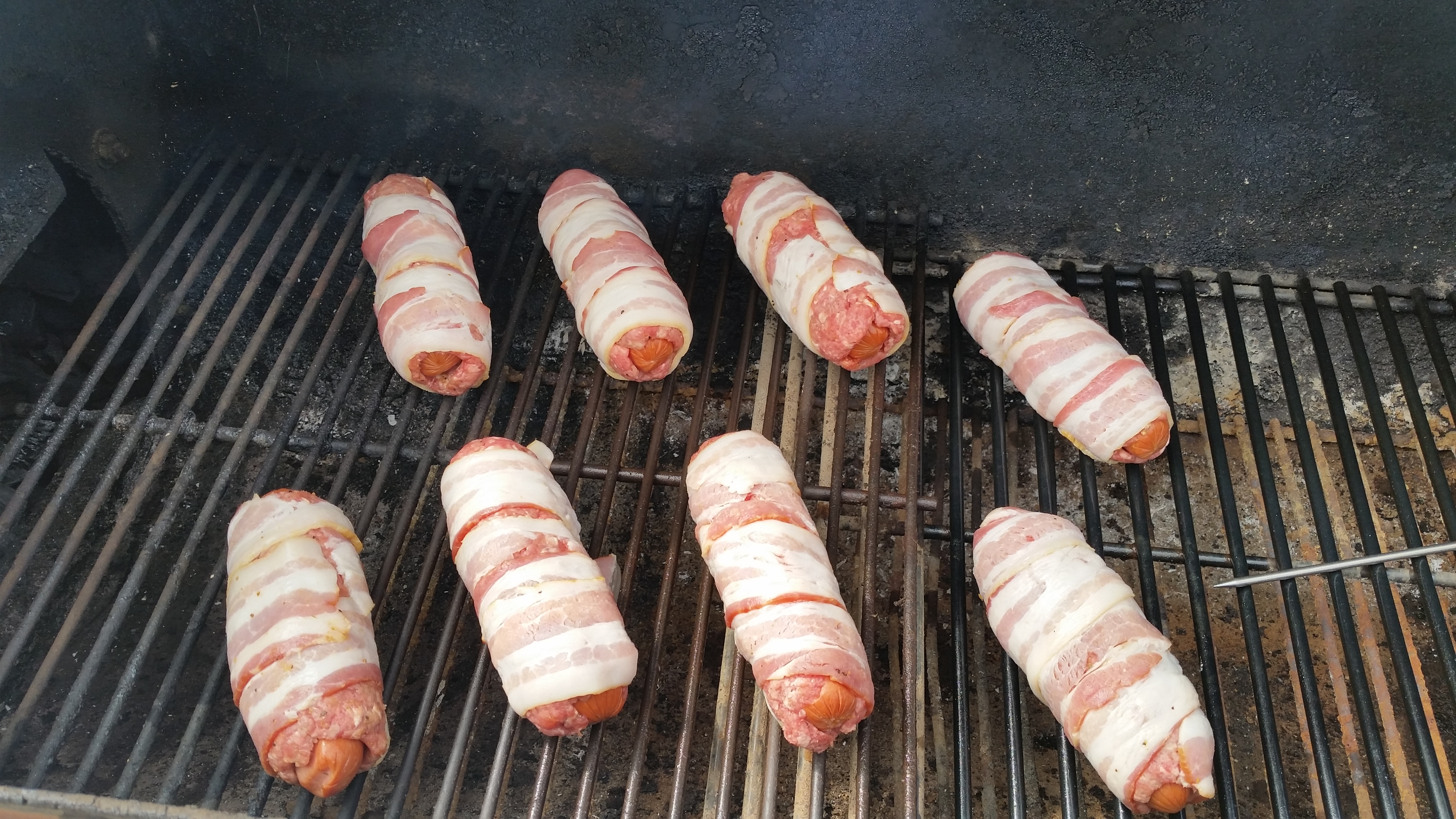 With a knife cut the ground beef into a strip as wide as the hot dog and start to roll the beef around your first Hot Dog. As you get the first wrap around the hot dog, cut the beef with the knife. With your hands continue to form the beef into a nice blanket around the Dog. Now take a strip of bacon and wrap it around the beef so that it all holds shape. When wrapping the bacon be sure to spiral it like a barber pole (or candy cane stripes for the people who have never seen a barber pole). I usually use two full strips of bacon, but if that is too long, use that knife and cut off the excess bacon. (I strongly disagree with the description of “Excess Bacon” there never can be too much bacon)