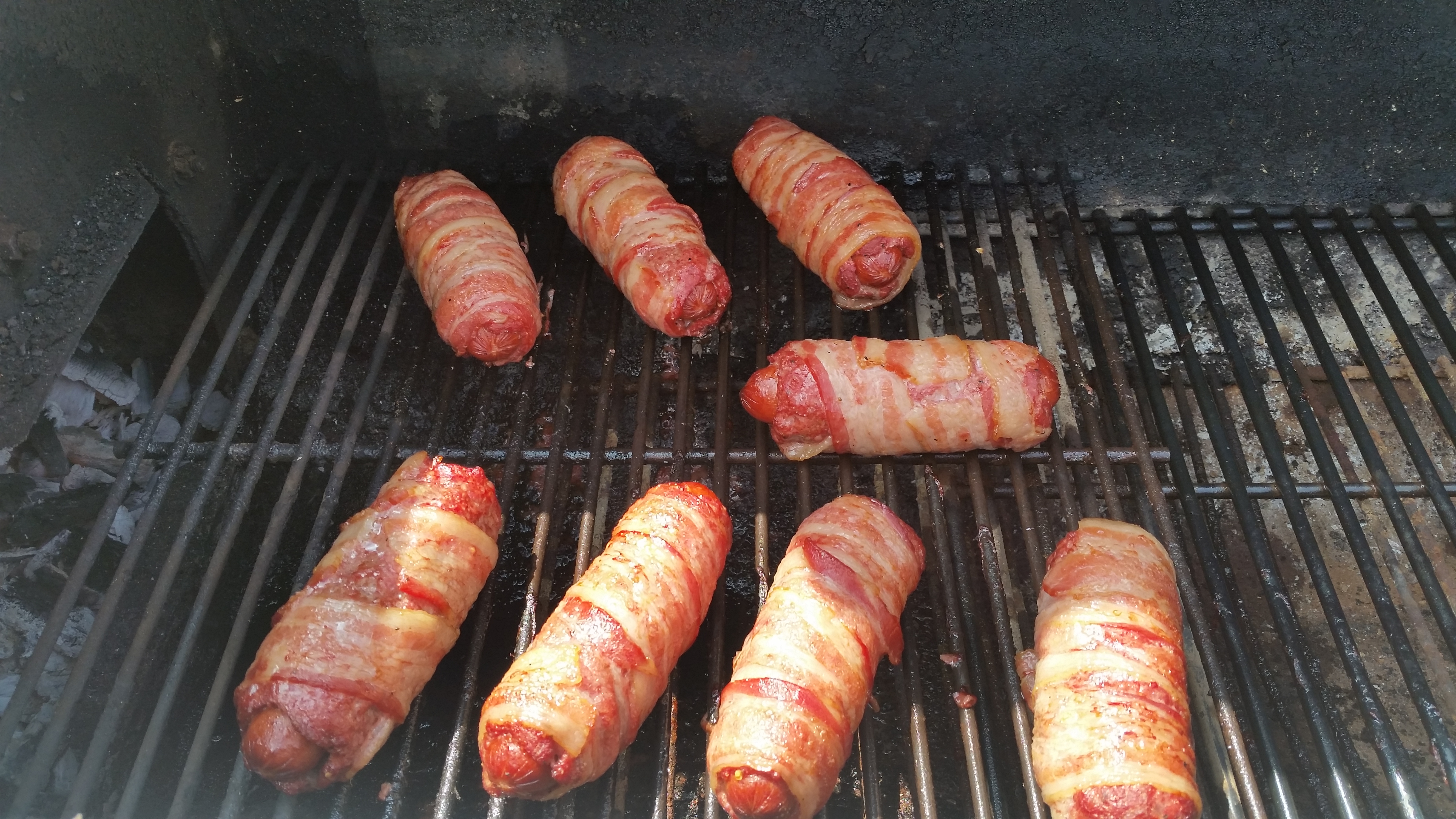 The Bacon Burger Dog’s require Indirect heat. Indirect Heat is most commonly understood as “smoking” your meat. But you don’t need a high end smoker to get the job done. You can cook with indirect heat on a weber kettle, gas grill or a smoker. Just light the fire on one side of the grill and have the opposite side with no heat/flame under the BBD’s. You want a good temperature around 350 degrees. On a gas grill this is going to be a medium-high to high setting on one side of the grill and leave the burners off on the meat side of the grill. During cooking, rotate the dogs every 10-15 minutes to get more uniform cooking. Especially if you’re using a gas grill. The heat will be more intense for the dogs nearest the heat source, so move them and rotate them. Now that the BBD’s are on the grill, drink the beer and watch your meat.